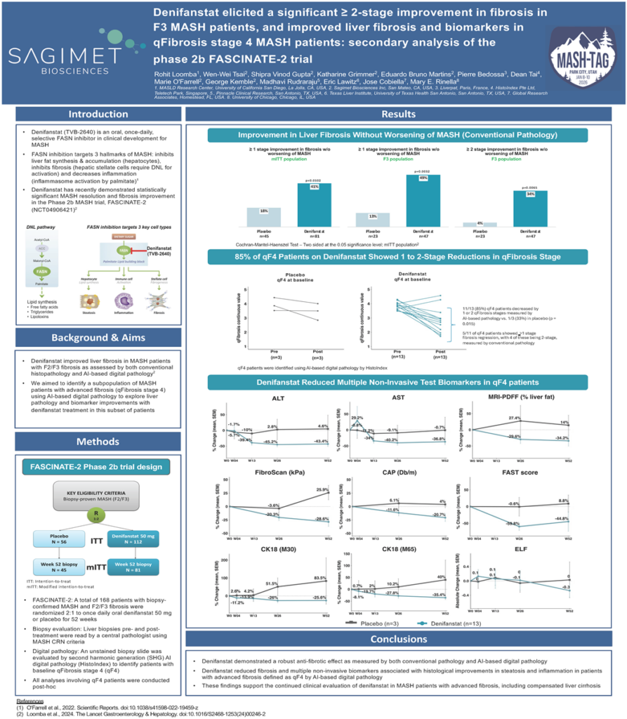 Denifanstat elicited a significant ≥ 2-stage improvement in fibrosis in F3 MASH patients, and improved liver fibrosis and biomarkers in qFibrosis stage 4 MASH patients: secondary analysis of the phase 2b FASCINATE-2 trial